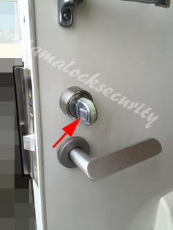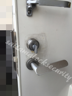0120-338-599アパートの玄関ドアで、GOAL LX ゴール製レバーハンドル錠の鍵交換工事例です。カバンを盗まれた!お客様から「家の鍵も無いので入れないし、住まいも分かってしまうので、すぐに!玄関の鍵を変えてほしい」とのご相談がありました。まずは、玄関ドアの鍵開けをおこなってから、シリンダーとサムターンの交換作業となります。