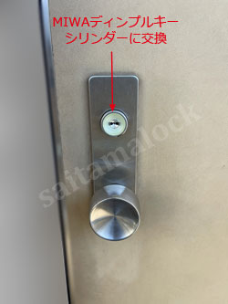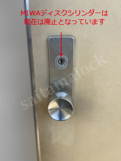 0120-338-599分譲マンション玄関ドアについている、 MIWAミワロック製ドアノブ錠の鍵交換工事例です。