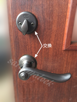 0120-338-599木製輸入玄関ドアで、Bor Dorren Door についている ASSA ABLOY アッサアブロイのレバーハンドル錠取付け工事例です。お電話での聞き取りでは築20年以上で今まで鍵交換や鍵の故障はしたことはなく、最近になって鍵の出し入れがしにくくなったのと、とくにハンドルの動きが悪くドアがうまく開かないということでした。現場で確認すると ASSA オリジナルシリンダー(鍵穴部分)とケースロックの部品が不具合を起こしています。錠前を外して洗浄復活を試みても錆がひどく、金属疲労もあって正常に動かない状態でした。お客様のご要望により、ハンドルの見た目も悪いのでドアノブも含めた、部品すべてをあたらしい製品に取り替えることになりました。ありがとうございました。