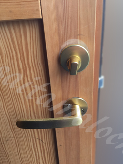 ドア外側 ABLOYオリジナルハンドルセットに取り替えました。扉厚70㎜仕様なので、付属品も標準仕様とは異なります。ディンプルキーシリンダーもそのままでは取付けられないので、オプションパーツを使いました