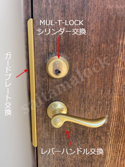 今回は故障していたケースロックとシリンダーの交換、傷んでサビが目立っていたレバーハンドル、同様に消耗したシリンダーカバーとサムターンのすべてをASSA ABLOYアッサアブロイ製のオリジナル現行部品に取り換えさせていただきました。