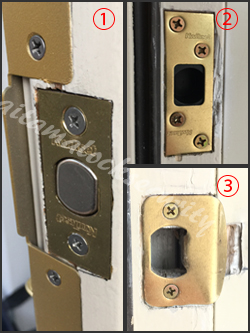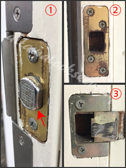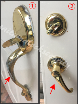 0120-338-599外国製ドアハンドル錠で、TITAN/Kwikset タイタン/クイックセットの交換工事例です。現場調査をさせていただくと鍵の調子が悪いのと、内側レバーハンドルがすでに壊れて垂れ下がった状態でした。消耗による部品劣化が原因ですが、根本的な問題はドア本体の傾きや戸と戸枠のズレによるものです。ハンドルを「強く押し引き」しないとドアが閉まらない、または鍵を開け閉めできない場合がそれにあたります。そのままにしておくと、錠前のラッチ部とカンヌキ部に相当な負荷がかかり、故障を誘発するのはもちろん、錠全体の部品寿命も短くなると考えられています。