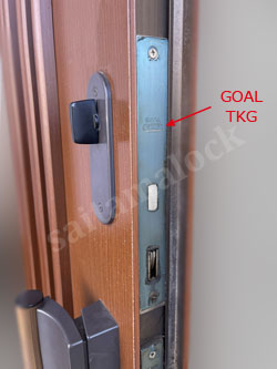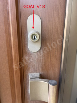 0120-338-599旧三協アルミ(現・三協立山アルミ)「サンテノール」玄関ドアについている、 GOALゴール製V18TKGタイプの鍵交換工事例です。