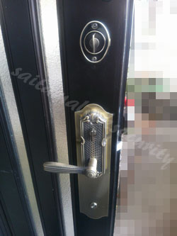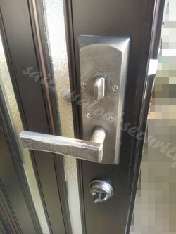 YKK玄関ドアのレバーハンドル錠からサムラッチ錠に交換取付けした工事例でした。