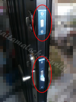 加えてこのシリーズは、最初から補助錠がドア下(主錠・レバーハンドル錠の下)に取付けられていることが多いため、鍵を開け閉めするさいに家人は、身体を前かがみにするしかなく不便でした。今回の工事で操作性を良くするため、補助錠の位置を主錠より上の部分に設定し、下枠から140㎝の高さに新規取付けいたします。これで、直立時に目のとどく範囲になるので、鍵の施錠・開錠も楽になります。