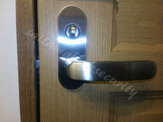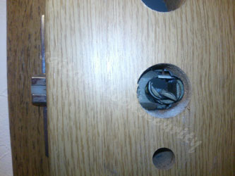 さて、まずはドアを傷つけないように、養生テープなどで保護してから解錠作業をおこないます。そして、ドアを開けたあとに同じタイプのレバーハンドル錠を取付けれ作業は終了です。