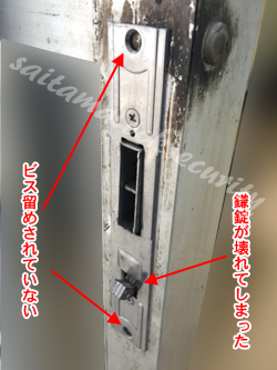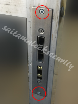 0120-338-599戸建ての勝手口として使われている、ガラス引違い戸の鍵交換工事例です。建物からして、築40年以上は経過していると思われます。お客様から「引き戸が開かなくなった!!」とご相談を受けました。伺って戸を解錠した後に調べると、引違い戸錠が壊れて動かない状態でした。聞き取りでは数年前に新しく交換されたとの話でしたが、不具合の原因は戸車の不良と、錠の取付け方法に問題があったと考えられます。